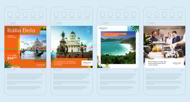 Para enriquecer visualmente os materiais e representar as várias opções de viagem que a empresa atende, criamos ilustrações representativas das principais possibilidades. Elas funcionam como elementos individuais que podem compor as peças de diferentes formas, cores e tamanhos.